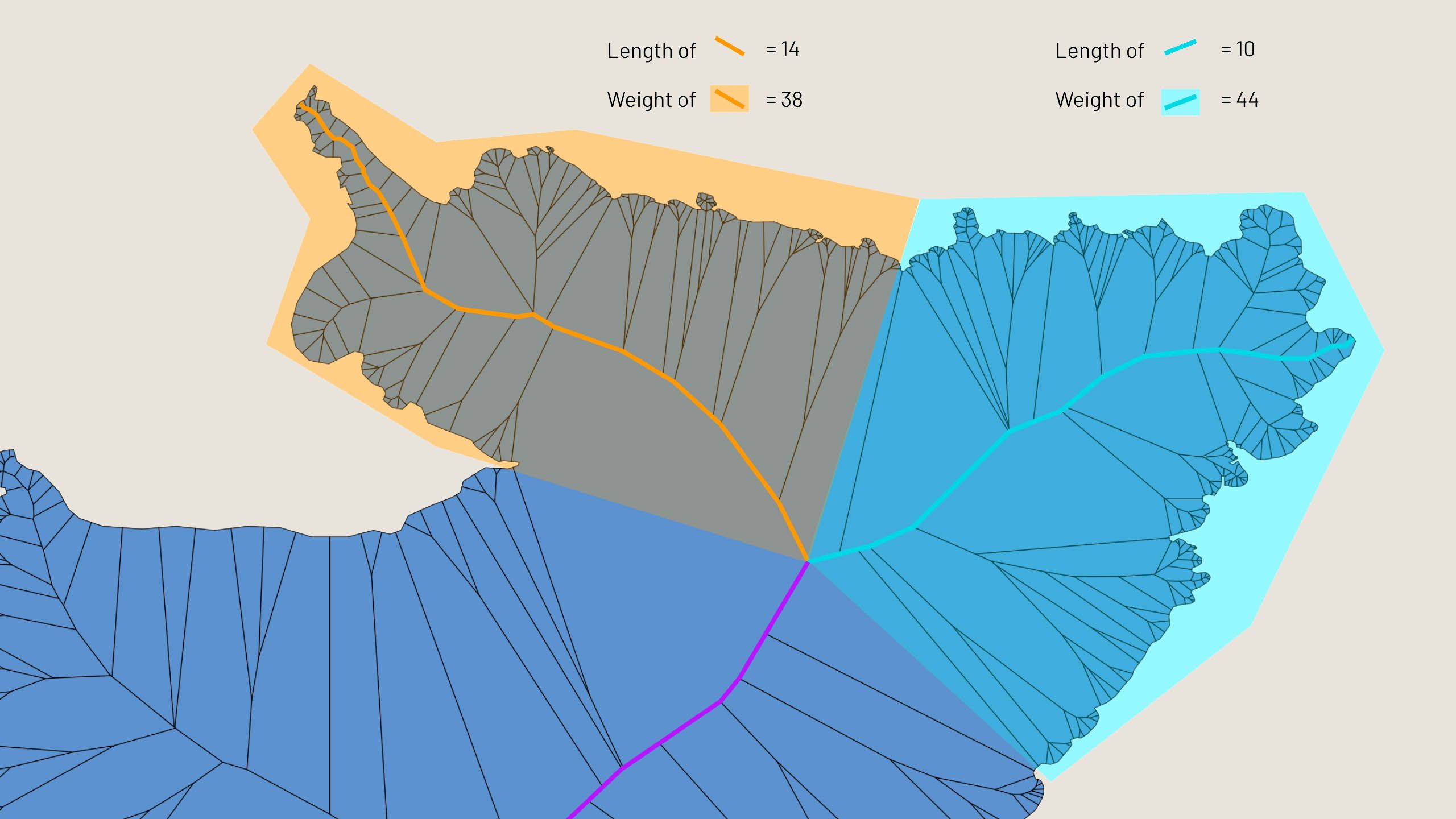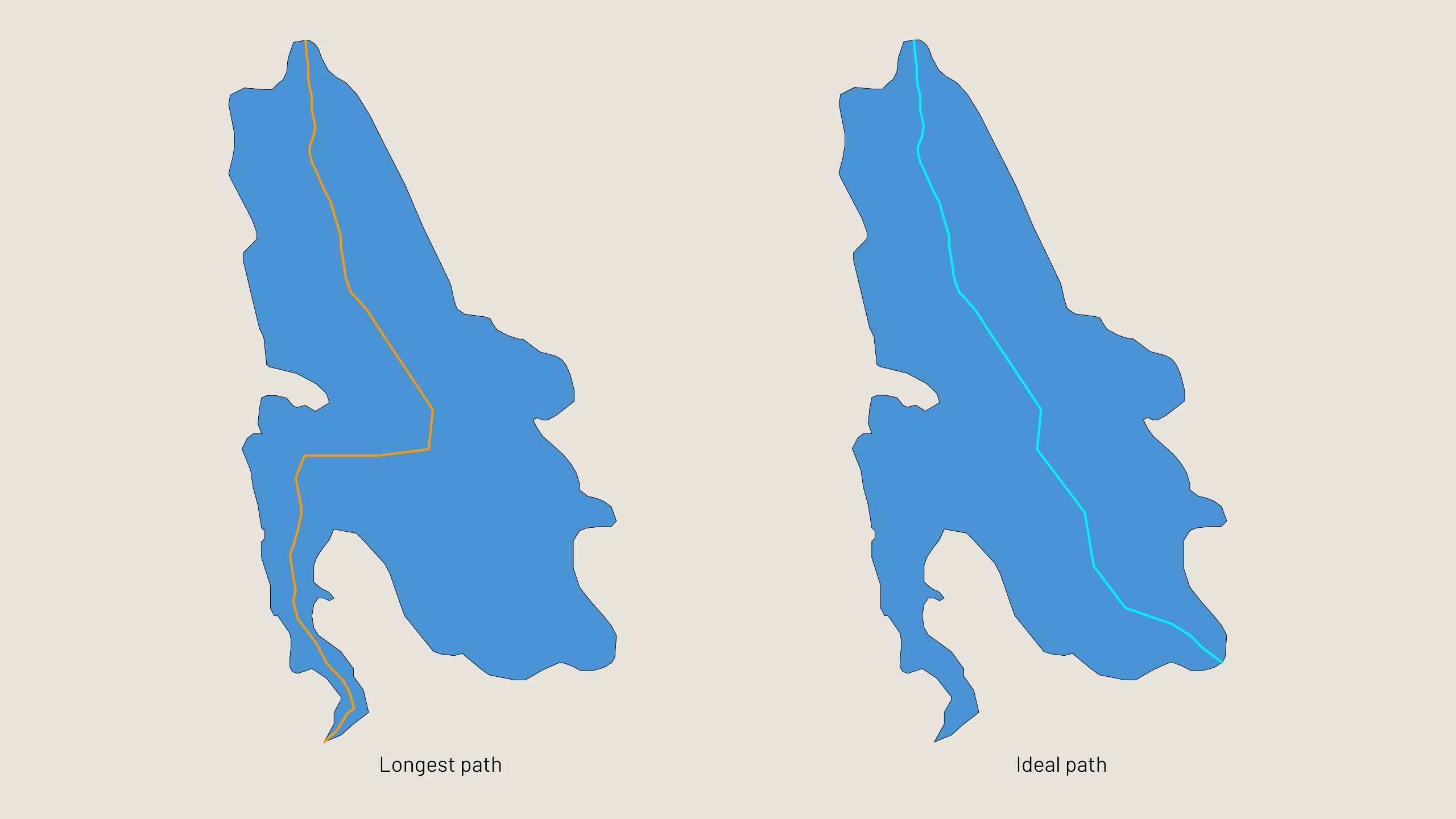 After examining a variety of cases, I felt the longest line through the graph wasn’t always right visually. In shapes such as reservoirs with long branching arms, the longest line would follow one of these long branches rather than staying with the visual bulk of the polygon. I needed to find a way to estimate a path through the graph that followed this visual weight.